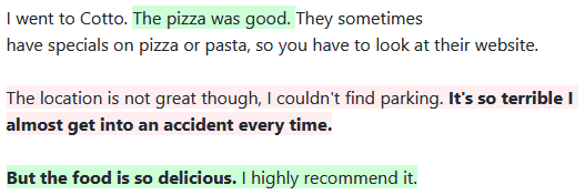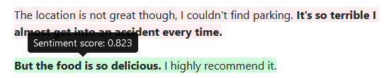 You should be able to see that sentences with positive sentiment are highlighted in green (e.g. "The pizza was good") and sentences with negative sentiment are highlighted in red (e.g. "The location is not great though, I couldn't find parking"). Sentences with neutral sentiment have no highlighting (e.g. "I went to Cotto"). Sentences with extreme sentiment in either the positive or negative direction are bolded (e.g. "The food was so delicious"). The exact sentiment score can be seen by hovering over a sentence:
